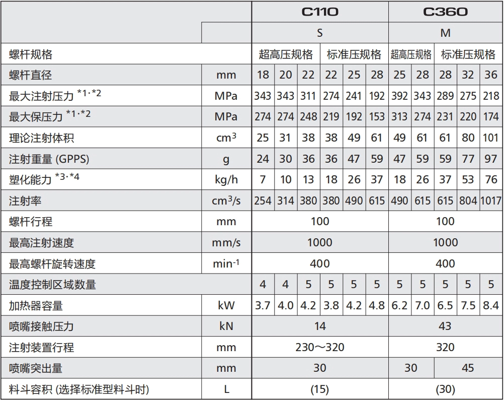 超高压螺杆比标准规格的最大射出压力提升30%。 螺杆阵容有φ18~φ36。