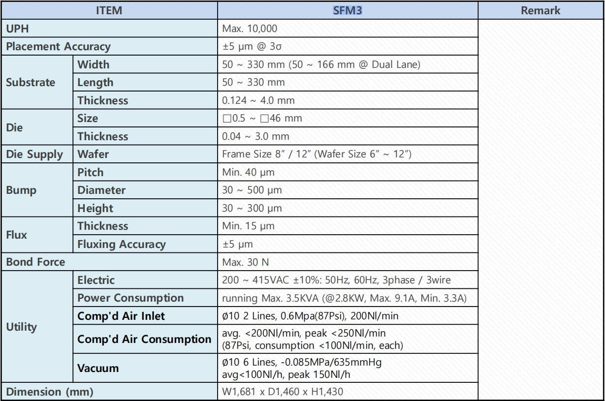 SFM 3 是一款技术成熟、性能稳定的高精度倒装芯片贴片机,适合对封装精度有高要求的半导体生产环境。